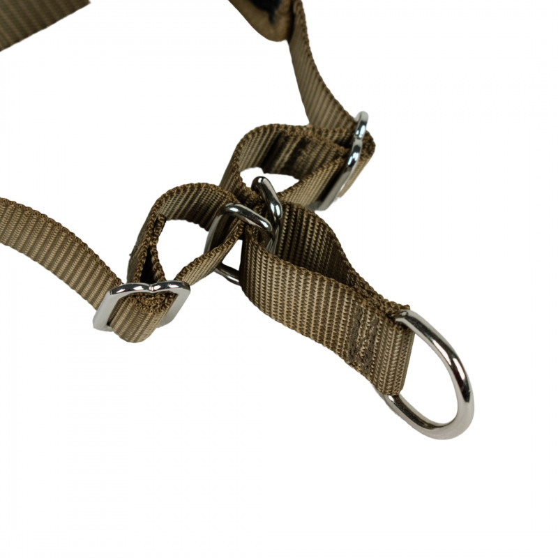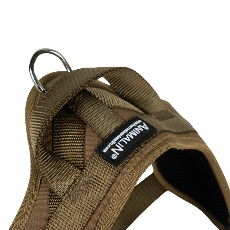 - un anneau sur le devant du poitrail pour un système antitraction ou pour garder un contact social, très cher à nos chiens, pendant la marche en laisse même si votre chien ne tire pas,