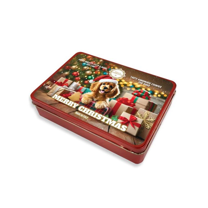 Une belle boîte en métal rouge contenant 140 g de biscuits faits à la main.